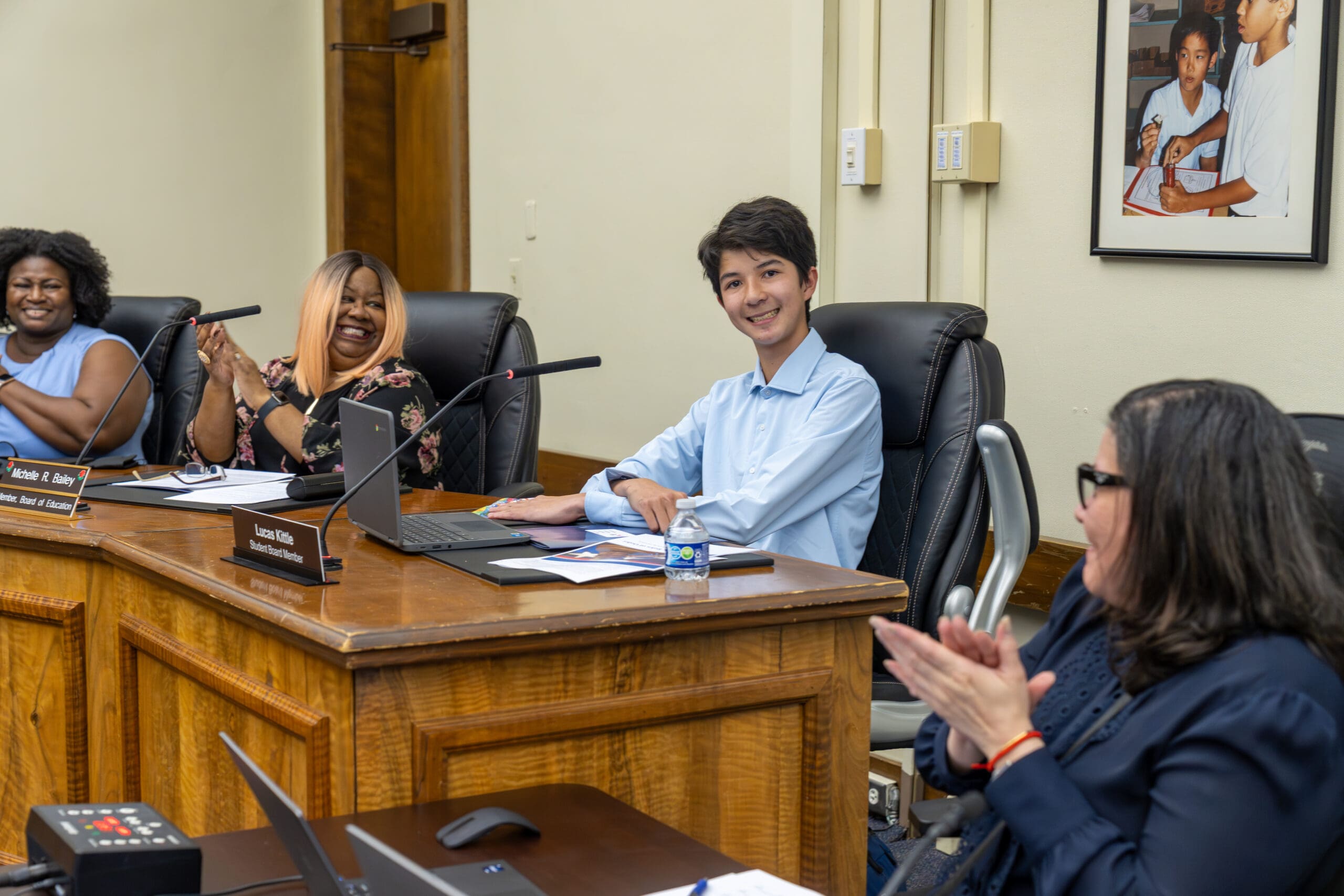 Images from PUSD’s December 11, 2025 board meeting: (Above) Student Council Member Lucas Kittle at the with board members Michelle Bailey and Patrice McKenzie in the background and Maria Montoya in the foreground; (Banner) New, reelected, and exiting Student Assembly/Council members alongside Student Think Tank’s election committee members as well as PUSD board members and Superintendent Blanco.