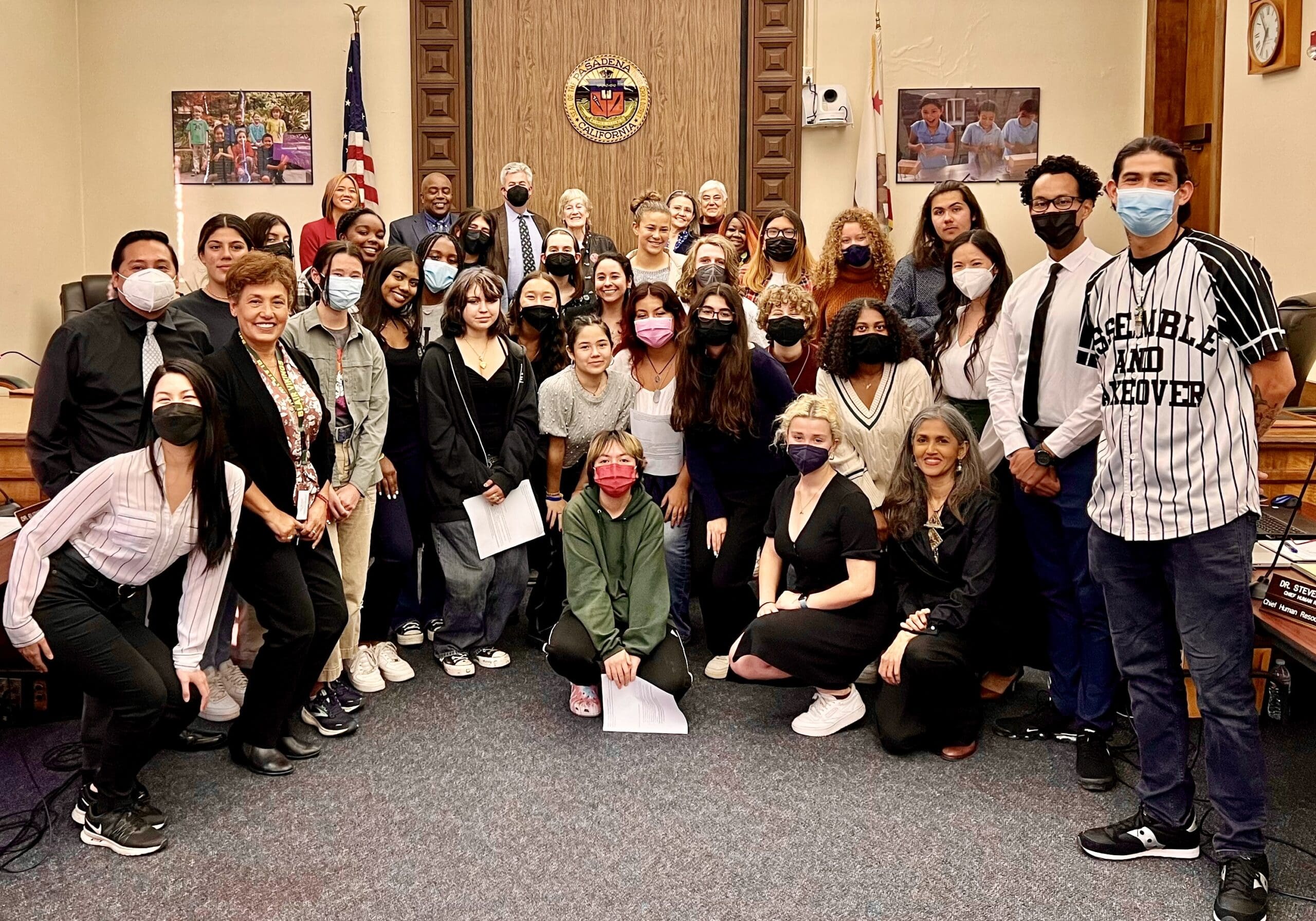 PUSD’s April 2022 board meeting with Board President Elizabeth Pomeroy and board; Superintendent Brian McDonald, Dr. Helen Chan, Jose Ortega; STT members (all who have since graduated); facilitator Sehba Sarwar; and PUSD’s Ethnic Studies teachers, including Manuel Rustin, David Flores, Totam Dao, and Rhyna Vasquez – some serve as STT/SAC advisors at their respective campuses.