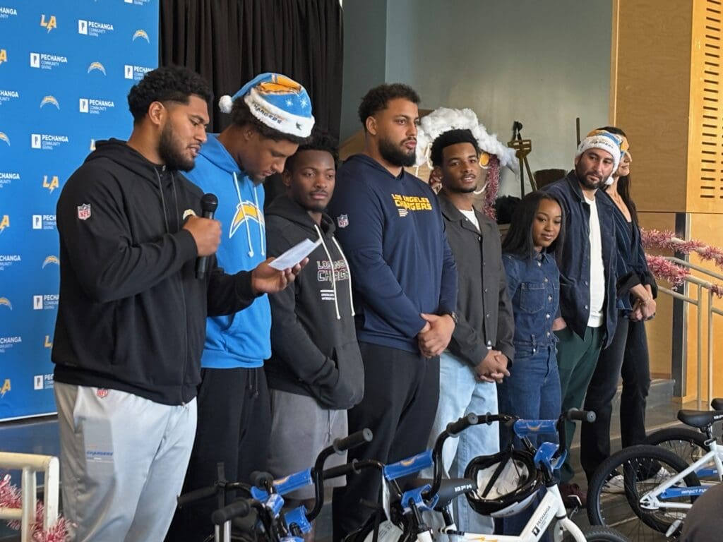 The celebration featured Los Angeles Chargers players Kimani Vidal, Oronde Gadsden II, and Tuli Tuipulotu, who helped present the bikes alongside cast members from the hit television series ALL AMERICAN. As part of the event, students in second and third grade received bikes and helmets just ahead of the holiday break.